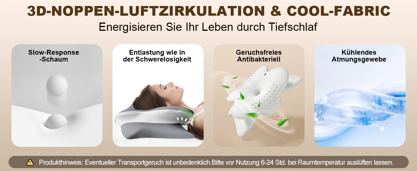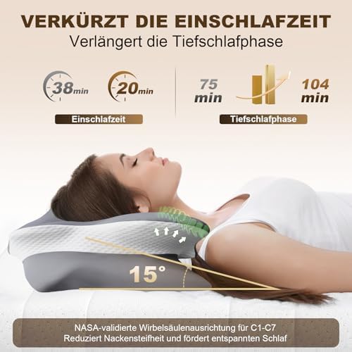 Das ergonomische Design mit einer 15°-Neigung ist NASA-validiert und sorgt für eine exzellente Ausrichtung der Wirbelsäule von C1 bis C7. Diese gezielte Unterstützung reduziert Nackensteifheit und fördert einen entspannten Schlaf. Besonders geeignet für diejenigen, die unter Schlafstörungen leiden, verkürzt unser Kissen die Einschlafzeit und verlängert die Tiefschlafphase, sodass Sie erfrischt und bereit für den neuen Tag aufwachen.