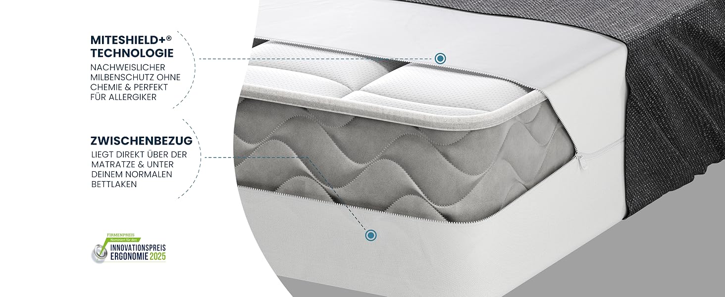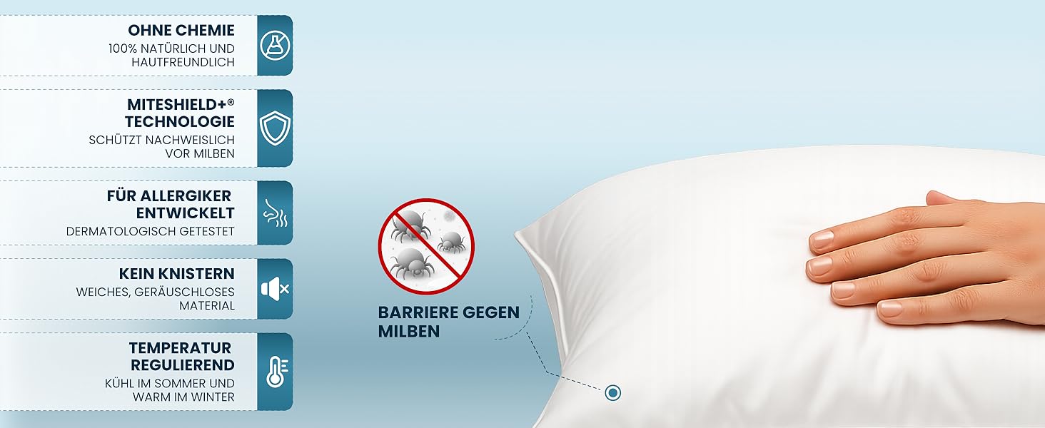 - Natürliche Anti-Milben-Technologie: Mit unserer Mitshield+ Technologie bieten wir chemiefreien Schutz gegen Hausstaubmilben.