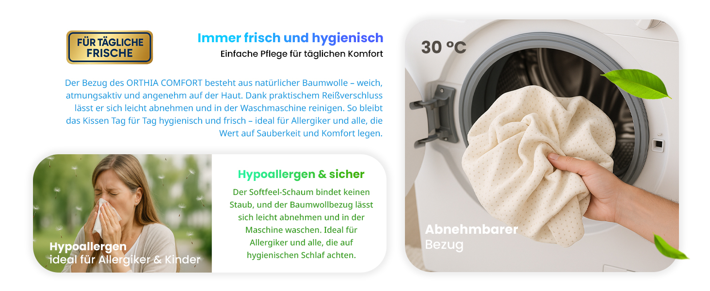 Das orthopädische Kissen ist nicht nur komfortabel, sondern auch praktisch: Der abnehmbare und waschbare Baumwollbezug erleichtert die Reinigung erheblich. Dank des hypoallergenen Softfeel-Schaums ist dieses Kissen perfekt für Allergiker und Kinder geeignet – langlebig, formstabil und frei von Schadstoffen.