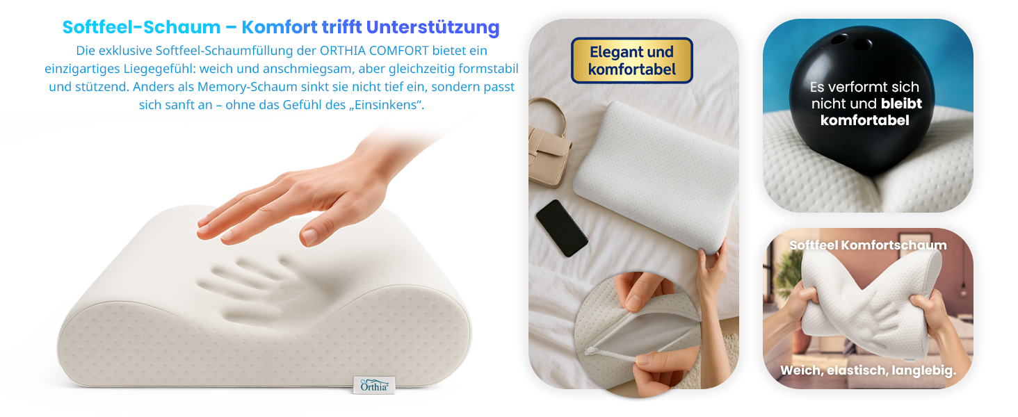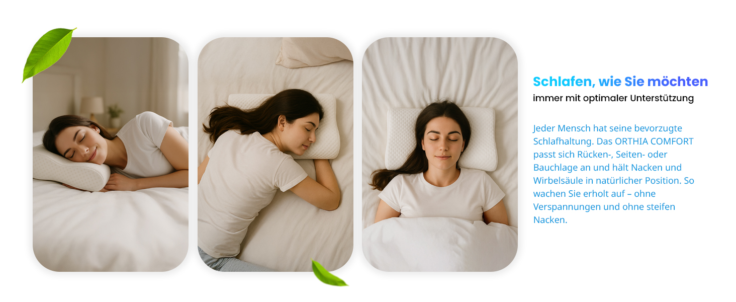Das ergonomische Design des Orthia Comfort Kissens sorgt für eine natürliche Ausrichtung der Halswirbelsäule. Dieses Kissen wirkt entspannend auf die Muskulatur, reduziert Verspannungen im Nackenbereich und lindert Beschwerden, die durch Fehlhaltungen im Alltag entstehen. Erleben Sie, wie Ihr Schlaf zu einem Ort der Erholung wird.