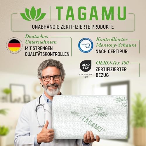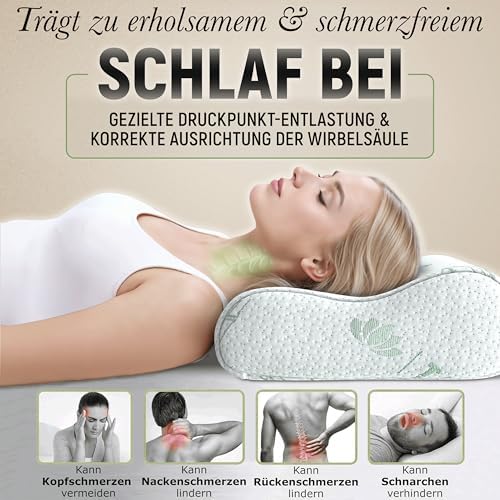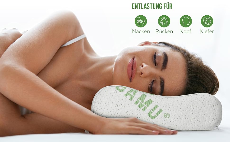 Das Kissen besteht aus hochwertigem Memory-Schaum, der sich perfekt den Konturen von Kopf und Nacken anpasst. Diese Eigenschaft garantiert eine optimale Druckentlastung und einen ergonomischen Schlafkomfort, insbesondere für Seitenschläfer. Ihr Kopf wird sanft gestützt, während die Wirbelsäule in der richtigen Position bleibt.